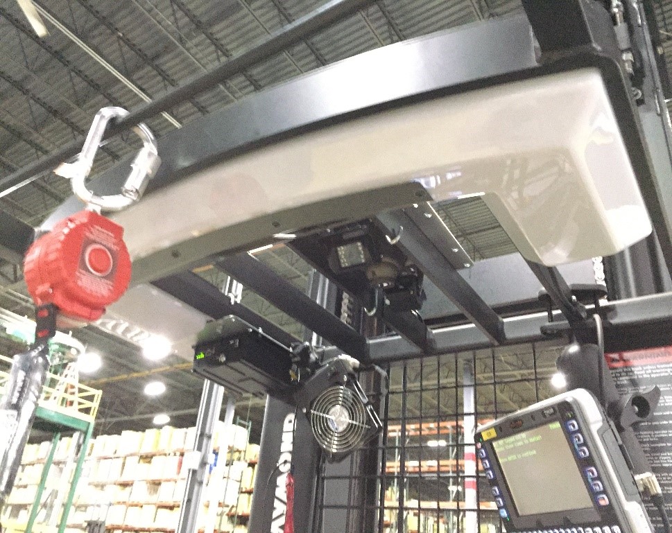 - Rear view camera, mounted on bracket, installed on Turret truck.